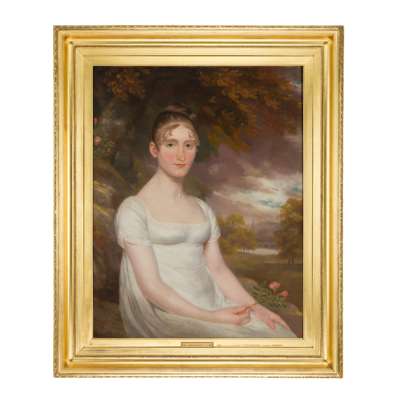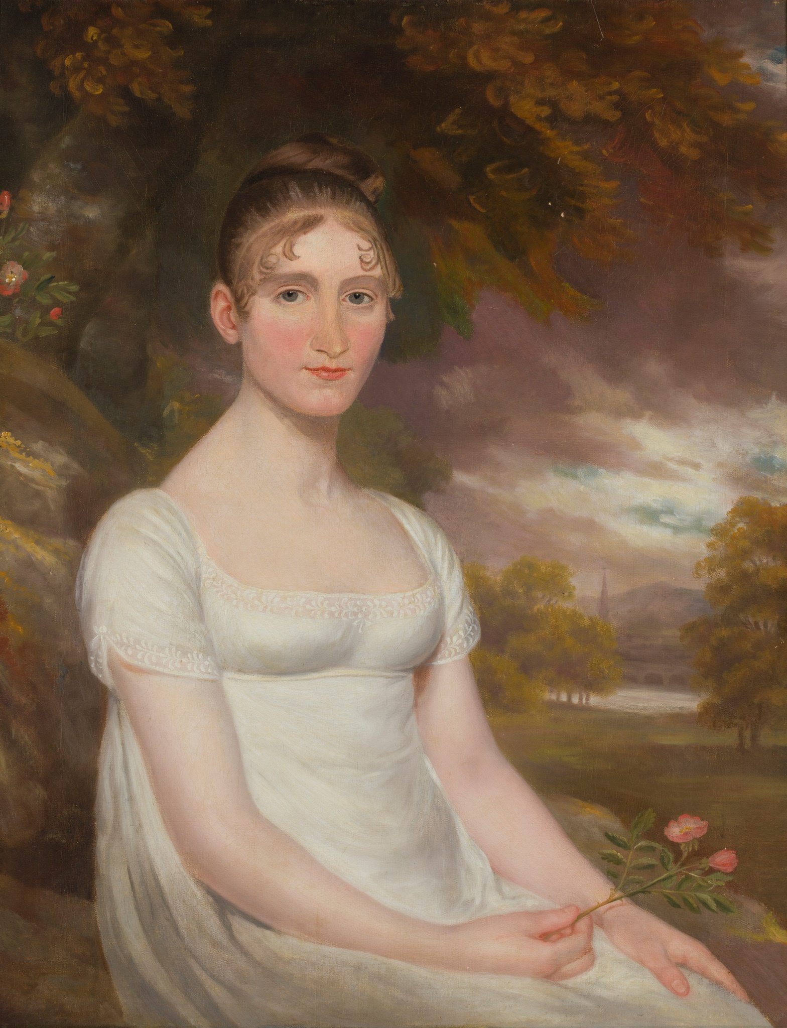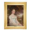 THREE QUARTER LENGTH PORTRAIT OF AGNES CRAWFORD SEATED IN WOODLAND