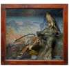 displayed in a stepped rocky diorama, one eating a songbird, the background painted in watercolour and pastel on paper depicting a mountainous landscape, in a stained wood case