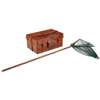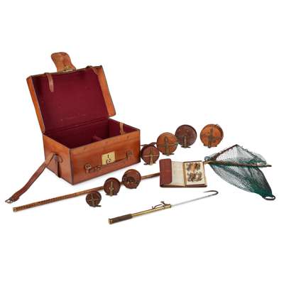 the leather case with brass hardware and stamped 'Hardy Brothers Ltd, Maker, Alnwick England', with seven mahogany and brass reels, a leather fly wallet, a brass gaff, a fishing priest, a Shots & Caps bobbin and a Salters brass tension scale, also with a brass mounted wood and bamboo y-shaped net, also stamped Hardy Brothers