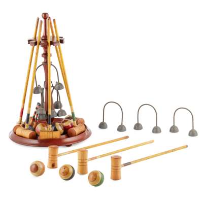 comprising a turned stand, fitted with eight miniature croquet mallets, eight balls, eight lead weighted wire hoops and a pair of centre pegs