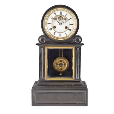 FRENCH BLACK SLATE MANTEL CLOCK, RETAILED BY JAMES MUIRHEAD, PARIS