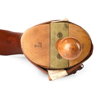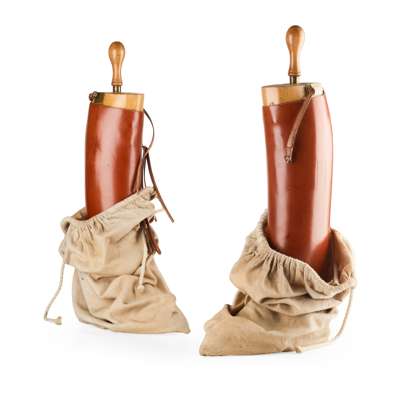fitted with a pair of handmade beech shoe trees with brass plates engraved 'Lord Falconer', the interior of each boot with gilt stamp 'Bartley & Sons, 493 Oxford Street, London' with hand inked serial number '114991' and name 'Lord Falconer', probably made for Arthur George Keith-Falconer, 10th Earl of Kintore, 12th Lord Falconer of Halkerton (British 1879 – 1966) or his father