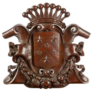 the scroll carved cartouche surmounted by a coronet and hung with a fruit filled garland