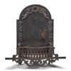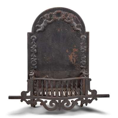 the arched back cast with a pair of putti and a laurel wreath with flower trails to the sides, above a wrought iron twisted spindle grate