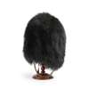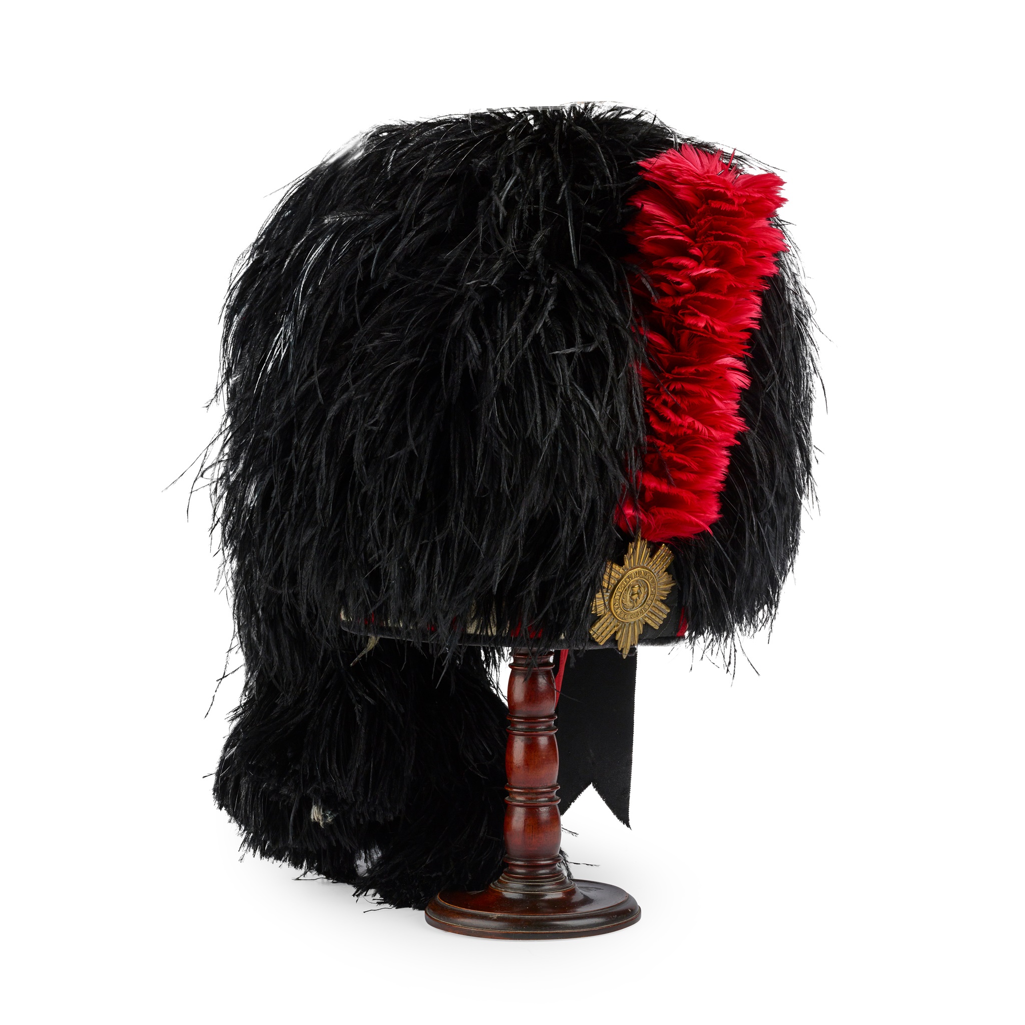 of black ostrich feather with red, white and black diced brim, black silk cockade backing silver regimental badge, and red feather hackle; together with a BRIGADE OF GUARDS BEARSKIN CAP with a mahogany stand
