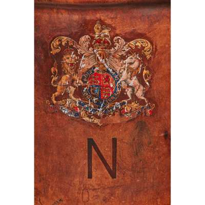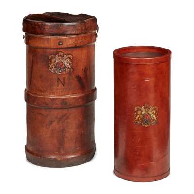 the larger with a Royal Coat of Arms over an embossed N, the cover embossed No. 76 and B.H.&G Ltd. II-1941; the other with a Royal Coat of arms and converted to a stick stand