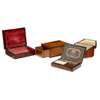 to include a bird's eye maple and parquetry box with brass stud decoration and a single drawer to one end, 24.5 long; a mahogany and kingwood banded jewellery box with a brass bail handle and velvet lined interior, 25.5cm wide; a canted burr wood and banded stationery box with butterfly inlay, 21cm wide, one box with an ivory escutcheon; and a Winsor & Newton travelling burr wood paint box, complete with watercolour pots, ceramic mixing board, and water glass, 22cm wide