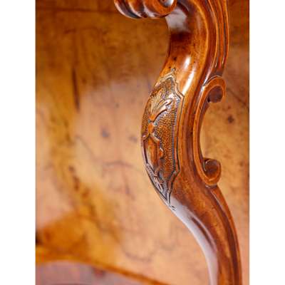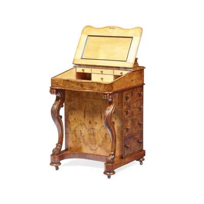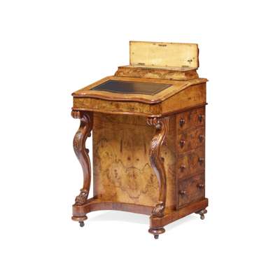 with a hinged superstructure with pierced gallery above a slope with a black leather skiver, raised on carved scrolled supports with four drawers to one side and dummy drawers opposing, on wood castors