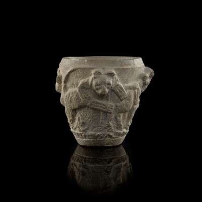 carved limestone, standing on a flat base, gently flaring body carved with an energetic scene of two lions attacking a bull carved in high relief, the lip recessed