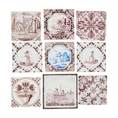 various figural and floral subjects, one centrally painted in cobalt; together with a MINTON MANGANESE 6 IN. TILE, 19th century, in the Dutch style