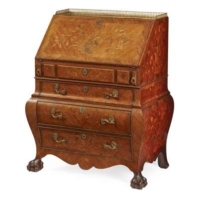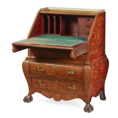 DUTCH STYLE KINGWOOD, WALNUT, MAHOGANY, AND MARQUETRY BOMBÉ BUREAU