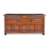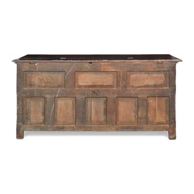 the hinged top opening to a void interior, above a foliate carved frieze and three-over-five panel front, raised on stile feet