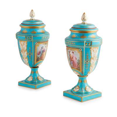 PAIR OF SEVRES STYLE URNS AND COVERS