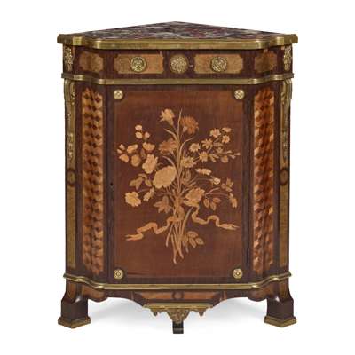 LOUIS XV STYLE KINGWOOD, AMARANTH AND MARQUETRY ENCOIGNURE, BY PAUL SORMANI, PARIS