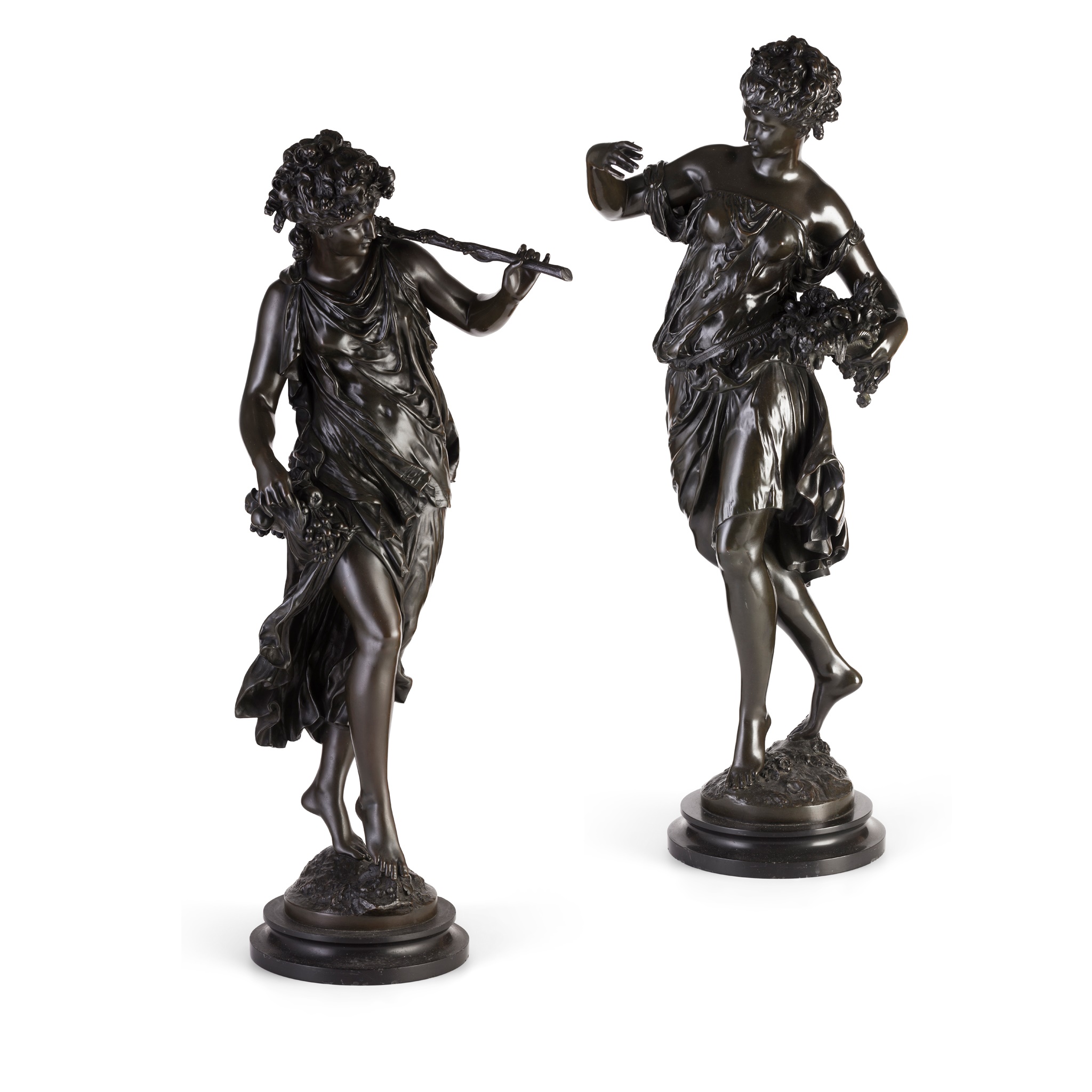 bronze, green-brown patina, each modelled as a dancing nymph, Summer holding a basket of flowers, Autumn with grapes, on circular bases signed 'Moreau Math' and ' E Colin & Cie/ PARIS'