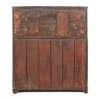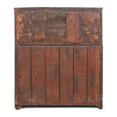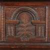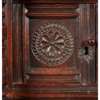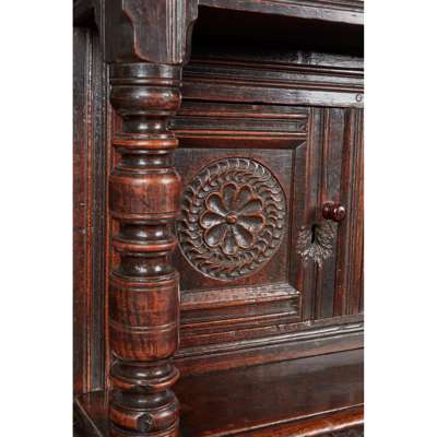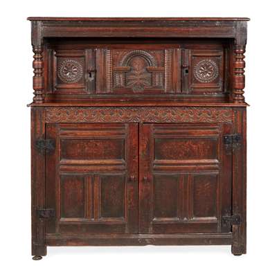 the superstructure with a central carved arcade flanked rosette carved doors and turned columns; the lower part with a carved frieze and twin-panelled cupboard doors, raised on stile feet