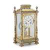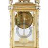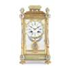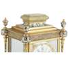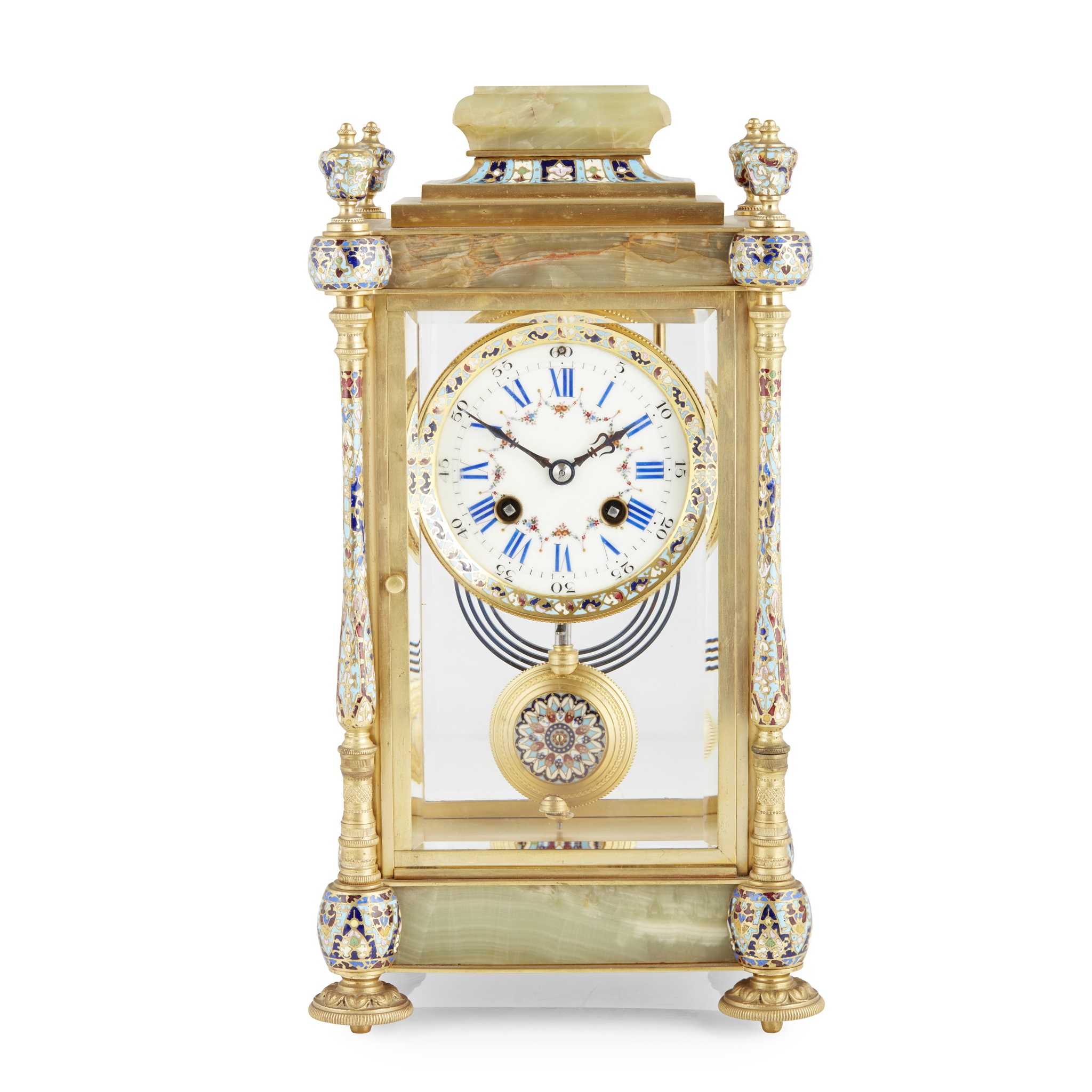 the cylinder movement with a painted cream dial with blue Roman numerals and floral swags, the moulded green onyx top over a four glass case with enamelled corner columns amd toupie feet, the twin-train movement stamped Vincenti & Cie and numbered 1141, striking the full and half hours on a gong