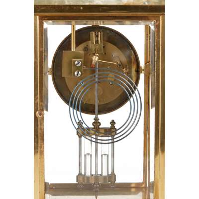 the cylinder movement with a gilt dial with Arabic numerals and central rosette mask, in a four-glass case with a waisted pediment and porcelain columns with scenes of lovers in a garden, on a stepped plinth base with palmette border, the twin-train movement striking a gong and stamped J Marti & Cie and numbered 1723, with mercury pendulum; together with a pair of urns en suite