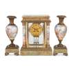 FRENCH GREEN ONYX AND PORCELAIN THREE PIECE CLOCK GARNITURE