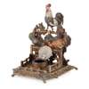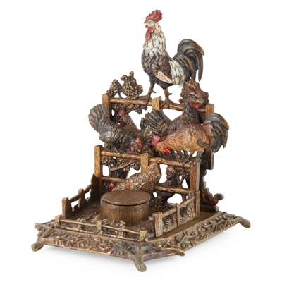 modelled as a country fence with a cockerel and hens forming a letter rack with a central lidded ink pot in the form of a well