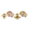 comprising a quatrefoil cup and saucer painted in puce with flower panels and putti; a matched quatrefoil cup and saucer painted with floral panels and courting couples; a chocolate cup and cover with a trembleuse saucer, the cup painted with a courting couple; and a twin handled cup and associated cover, the cup painted with pastoral scenes within a quatrefoil cartouche; all with underglaze blue crossed swords; some with gilded marks