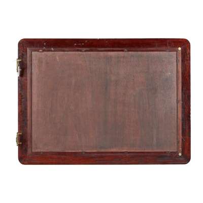 the rounded rectangular plate in a frame inlaid with mother-of-pearl, depicting phoenixes, flaming pearls, chrysanthemums, peonies, song birds, and shou symbols