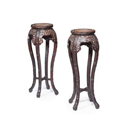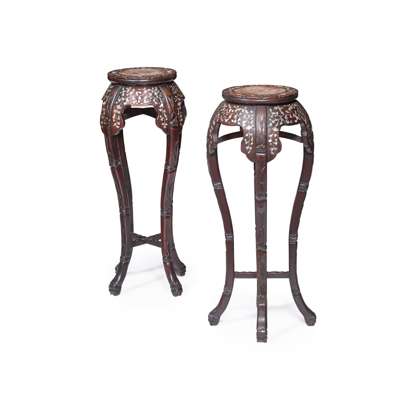 PAIR OF CHINESE HONGMU AND MOTHER-OF-PEARL MARBLE TOPPED STANDS
