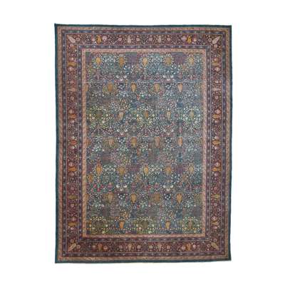 the bottle green field with allover cypress tree and foliate pattern, within indigo border