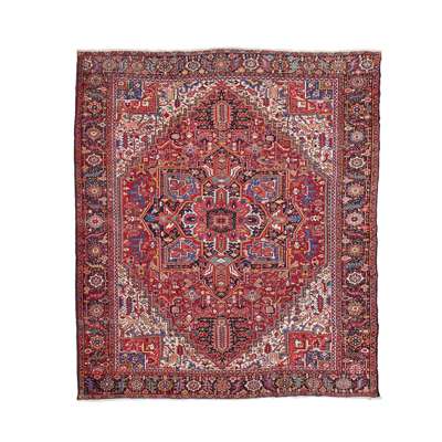 the red field with large indigo star medallion, ivory, salmon pink and blue spandrels, within indigo border
