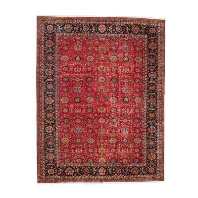 the red field with allover palmette and vine lattice pattern, within indigo border