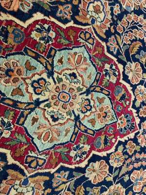 the indigo field with red and ivory medallion, similar spandrels, within red border