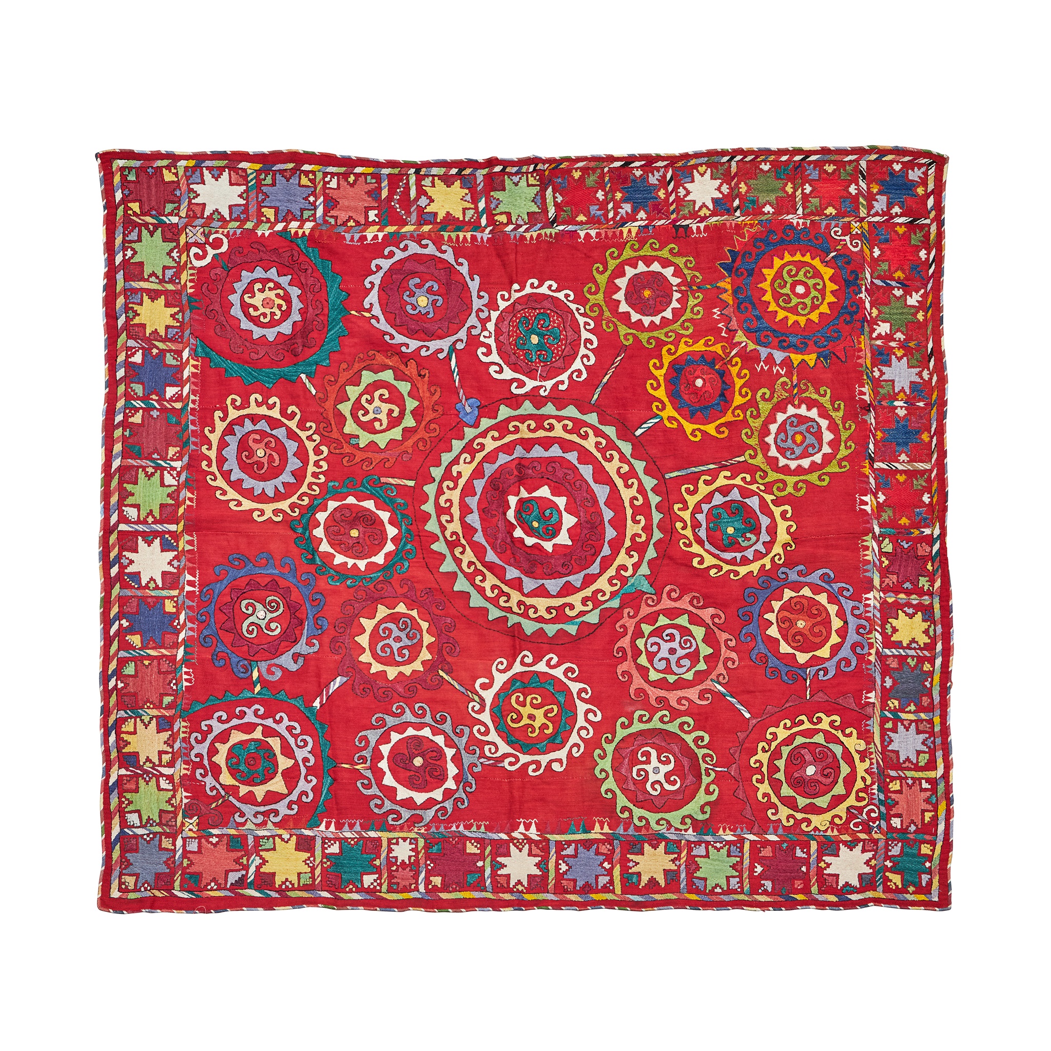 the red field with central circular medallion surrounded by smaller similar, within red border