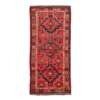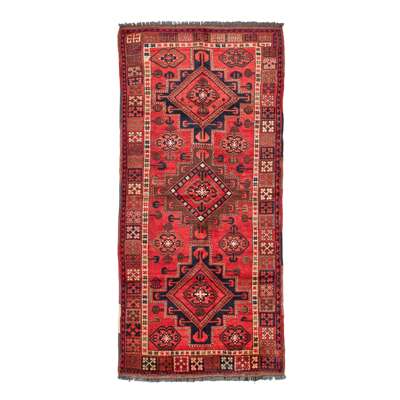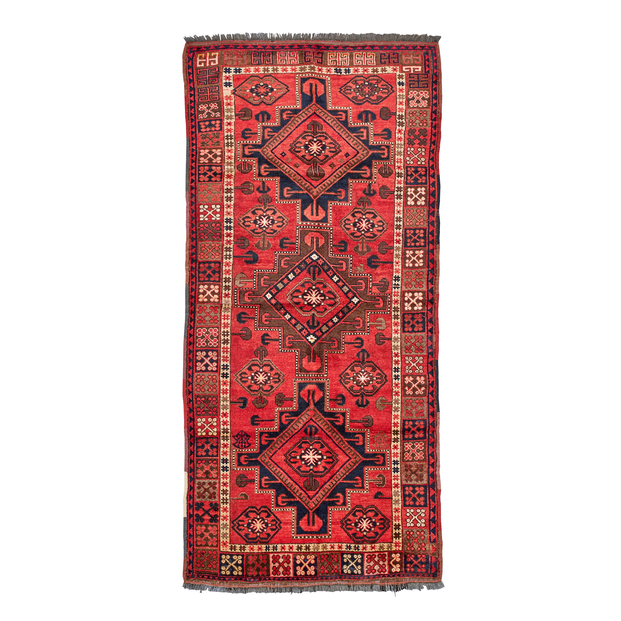 the red field with three indigo and brown stepped medallions, within polychrome border