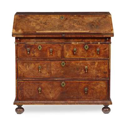 the crossbanded and featherbanded slope front opening to an arrangement of pigeon holes, drawers and a covered recess, over two short and two long drawers raised on bun feet