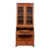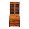 the cavetto moulded cornice above a pair of glazed doors enclosing adjustable shelves; the base with a featherbanded and crossbanded slope opening to an arrangement of pigeon holes, drawers, and a recessed compartment, above two short and two long drawers, raised on bracket feet
