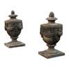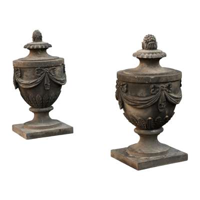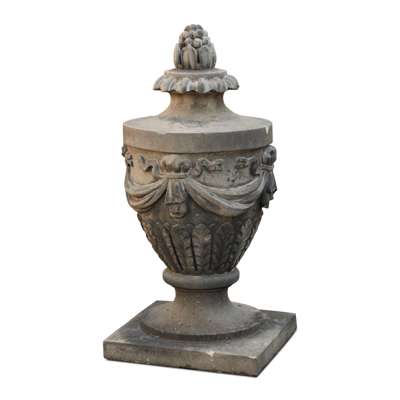 the partially leaf-fluted sides with drapery swags above, berry finials, on socle bases; together with a CARVED SANDSTONE URN, of similar form