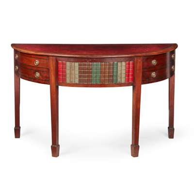 the demilune top with a red leather writing surface, above three frieze drawers with ebony banding, the reverse with leather book spines flanked by dummy drawers, raised on square tapered legs ending in spade feet