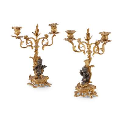 PAIR OF NAPOLEON III GILT AND PATINATED BRONZE FIGURAL CANDELABRA