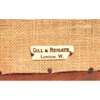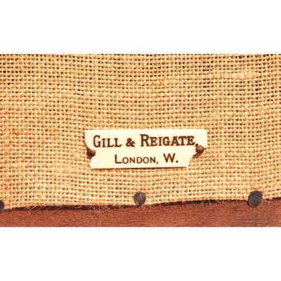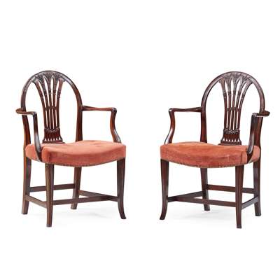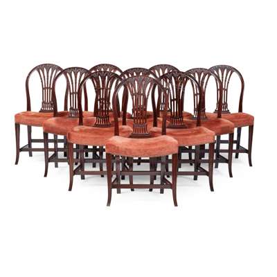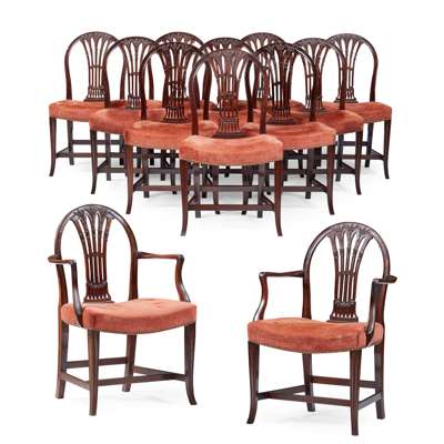 in the Hepplewhite style, with arched top rails and pierced splats carved with wheat fronds, above curved stuff-over seats covered in terracotta plush with brass nail trim, raised on moulded square legs joined by stretchers, comprising ten side chairs and a pair of armchairs