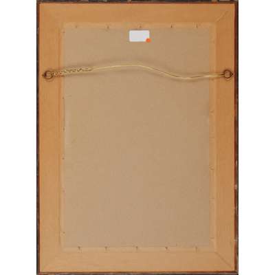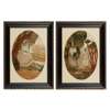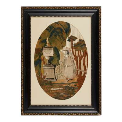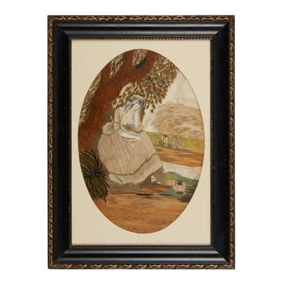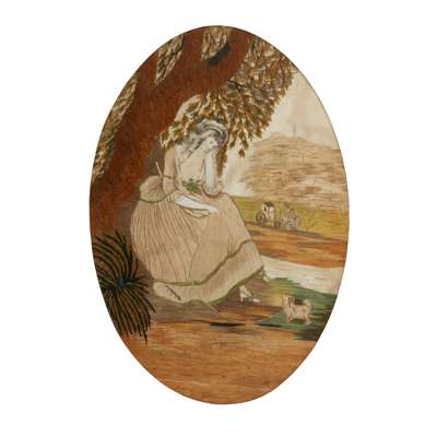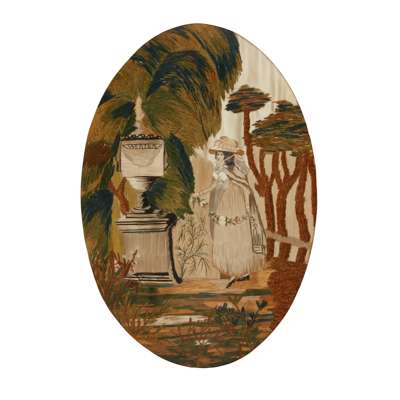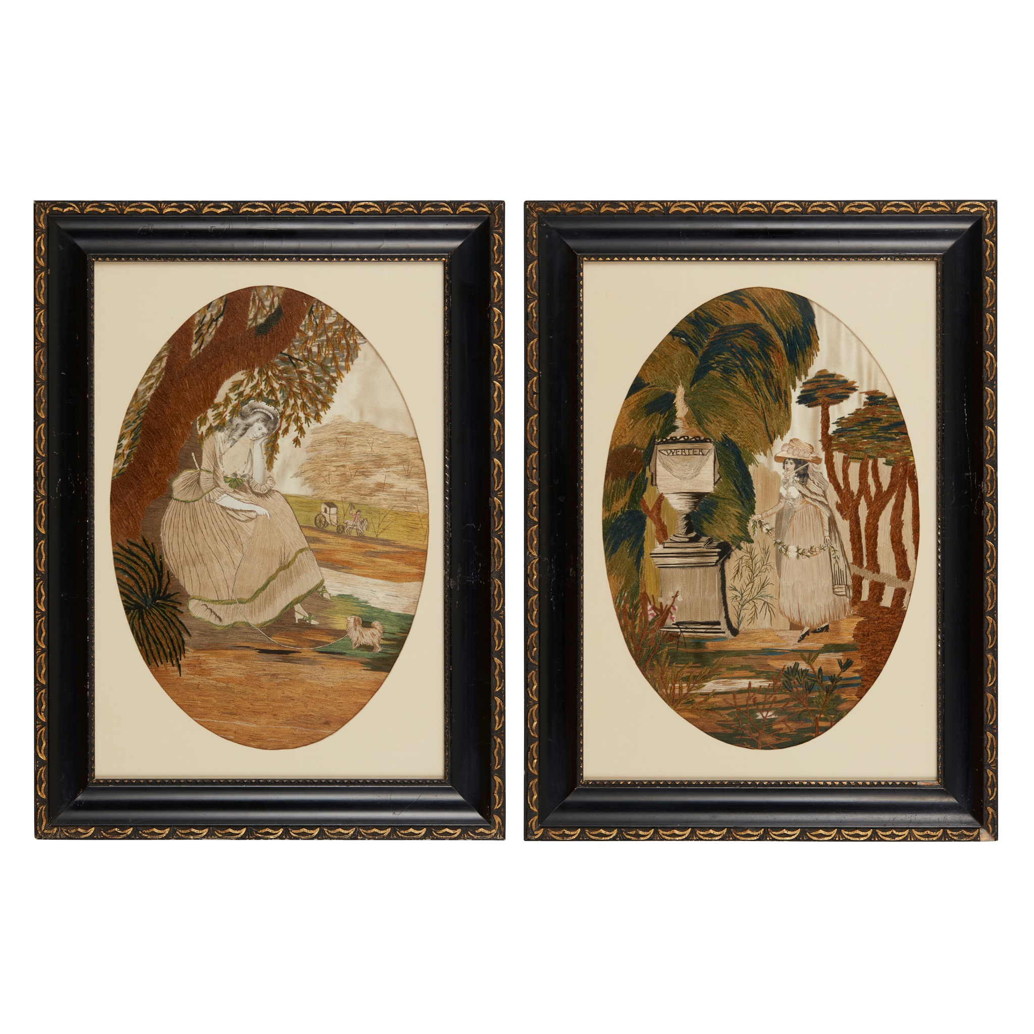 the first oval example depicting a woman holding a flower garland beside an urn monument titled WERTER, worked in silk and chenille; the other oval example depicting a woman with a small dog sitting under a tree, worked in silk and chenille, both 38 x 26cm, mounted in a later ebonised frames