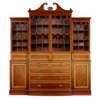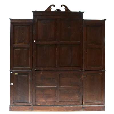 the swan neck pediment above a central pair of astragal glazed doors and a pair of dummy drawers concealing pigeon holes and drawers, flanked by matching doors all enclosing shelves; the lower part with a bowfront centre with two short over three long crossbanded drawers flanked by matching cupboards, on a conforming plinth base