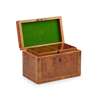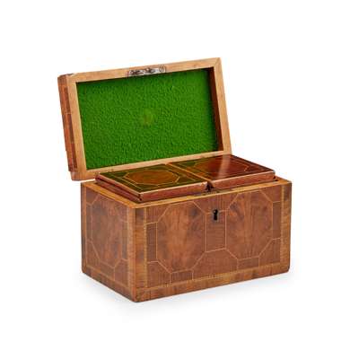 the crossbanded lid and sides with hatched banding and boxwood stringing, the hinged lid with a brass loop handle opening to reveal a double compartment interior, the caddies with similar parquetry panel lids