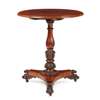 the circular crossbanded tilt top with a moulded edge, on a baluster and lotus-carved column and tripartite concave base raised on scrolled claw feet with castors