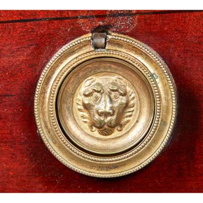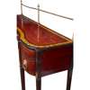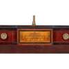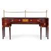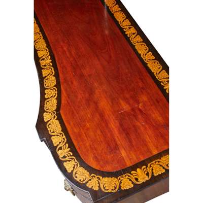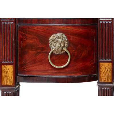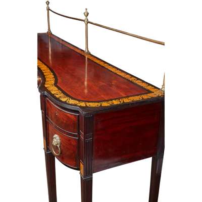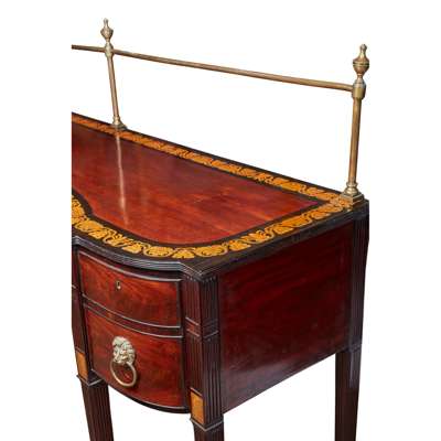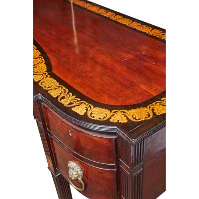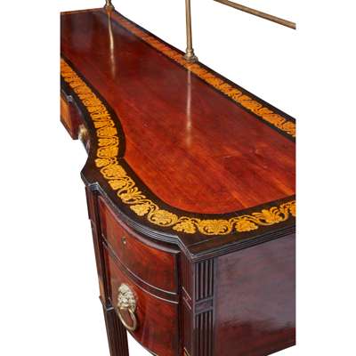 with a brass gallery rail above a shaped top banded in palmette inlay with penwork details, above a central tablet drawer with a further penwork panel depicting an allegorical scene flanked by short drawers and deep bowfront drawers with brass lion mask handles, raised on square tapered and reeded legs ending in carved paw feet