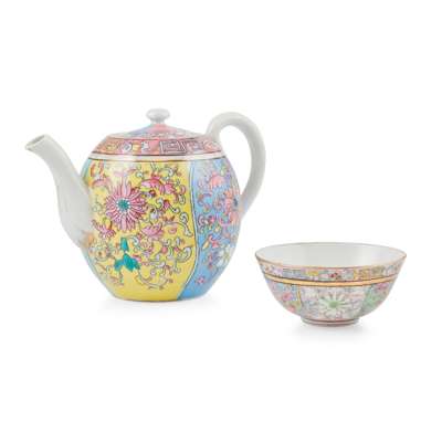 with printed and painted chinoiserie decoration in the form of stylised flowers and foliage on yellow, blue, pink and pale green ground panels, with a Greek key and leaf pattern border, gilt highlights, 16.5cm high, together with a GARDNER BOWL OF SIMILAR DESIGN, 12.5cm diameter; both with red printed factory marks, the bowl marked in black No. 546