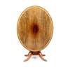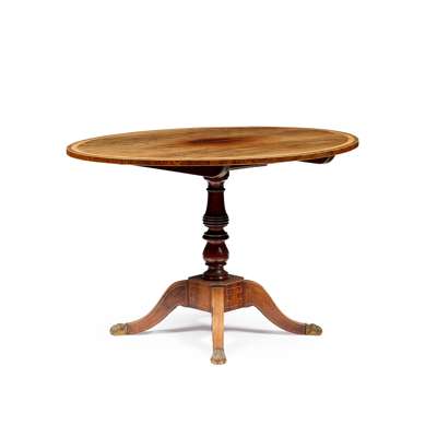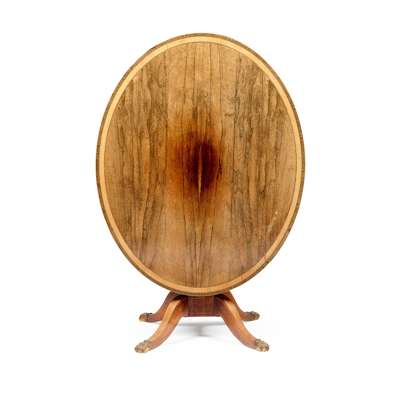 the banded oval tilt top on a turned baluster column and quadripartite platform base with outscrolling legs ending in brass hairy pair caps; with maker's stamp on the column block
