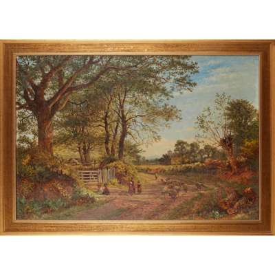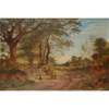 A WOODED COUNTRY LANE WITH FIGURES AND SHEEP