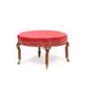 the shaped circular padded top upholstered in plum velvet with brass nail trim, raised on foliate carved square cabriole legs ending in brass caps and castors