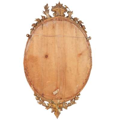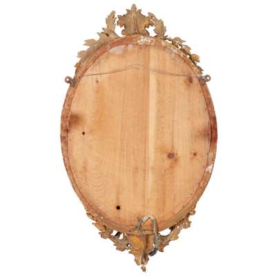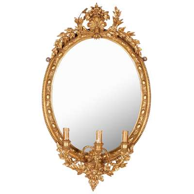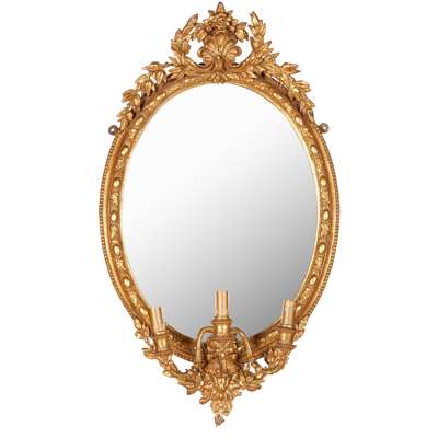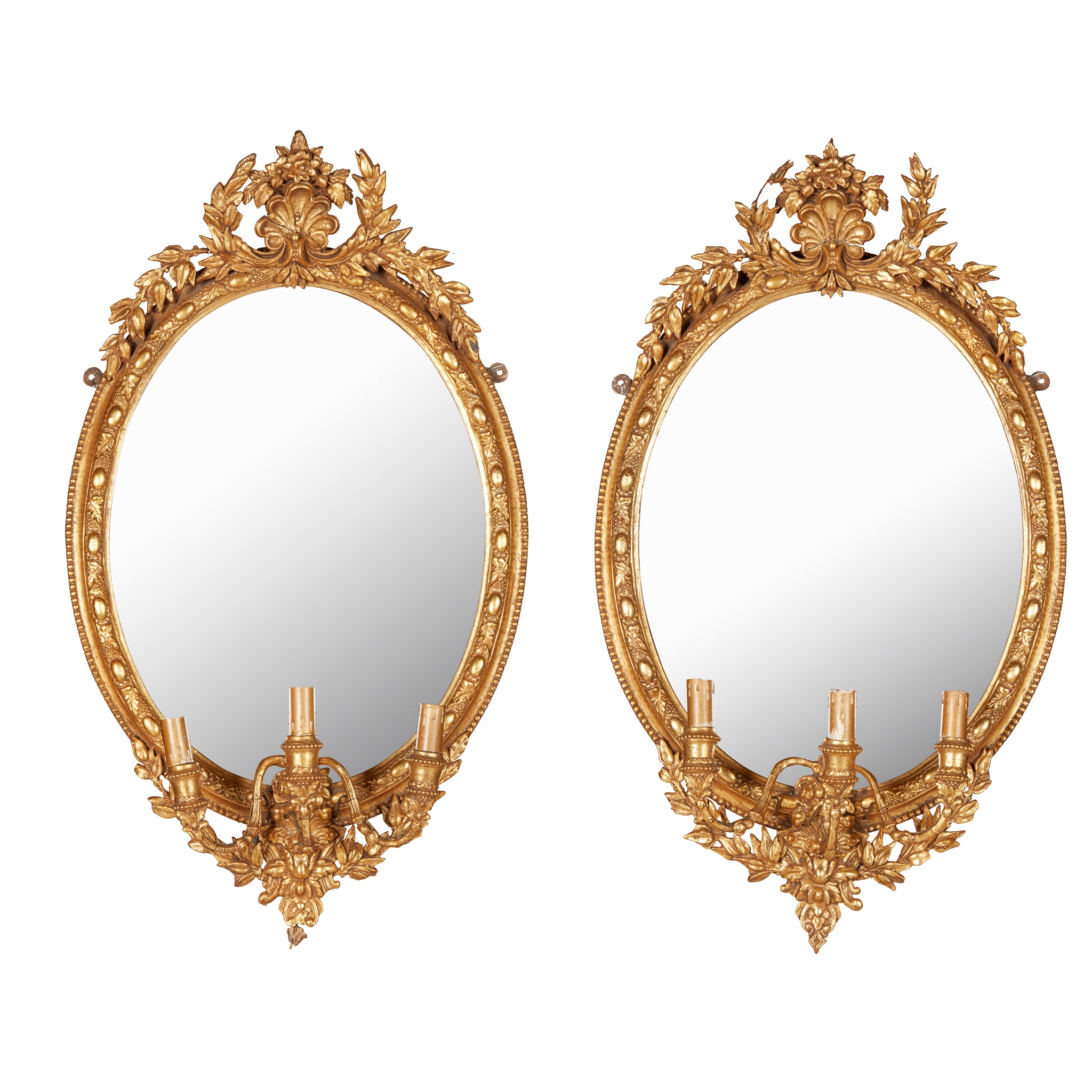 the oval mirror plates in bead and leaf moulded framed with shell and laurel garland crestings, each issuing three candle branches