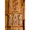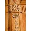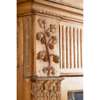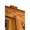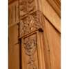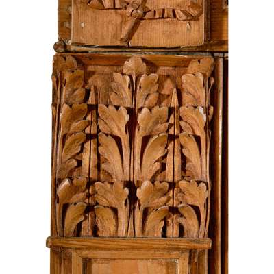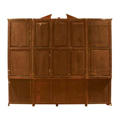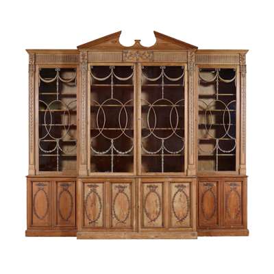 of shallow profile, the broken arch pediment above a fluted frieze carved with foliate scrolls and ivy, over four doors with ribbon-tied swags and husk garlands carved astragals flanked and divided by acanthus capped pilasters carved with bellflower trails, all enclosing adjustable shelves; the breakfront base with four double-panel moulded doors carved with ribbon-tied oval laurel wreaths, on a conforming plinth base